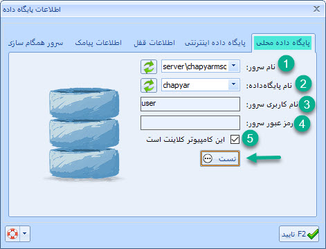 در صورتی که میخواید از نام پایگاه داده مطمئن شوید ، تنظیمات پایگاه داده نرم افزار رو روی سیستم سرور باز کنید و هر چیزی که توی فیلد نام پایگاه داده سیستم سرور وارد شده است روی سیستمهای کلاینت هم وارد کنید.